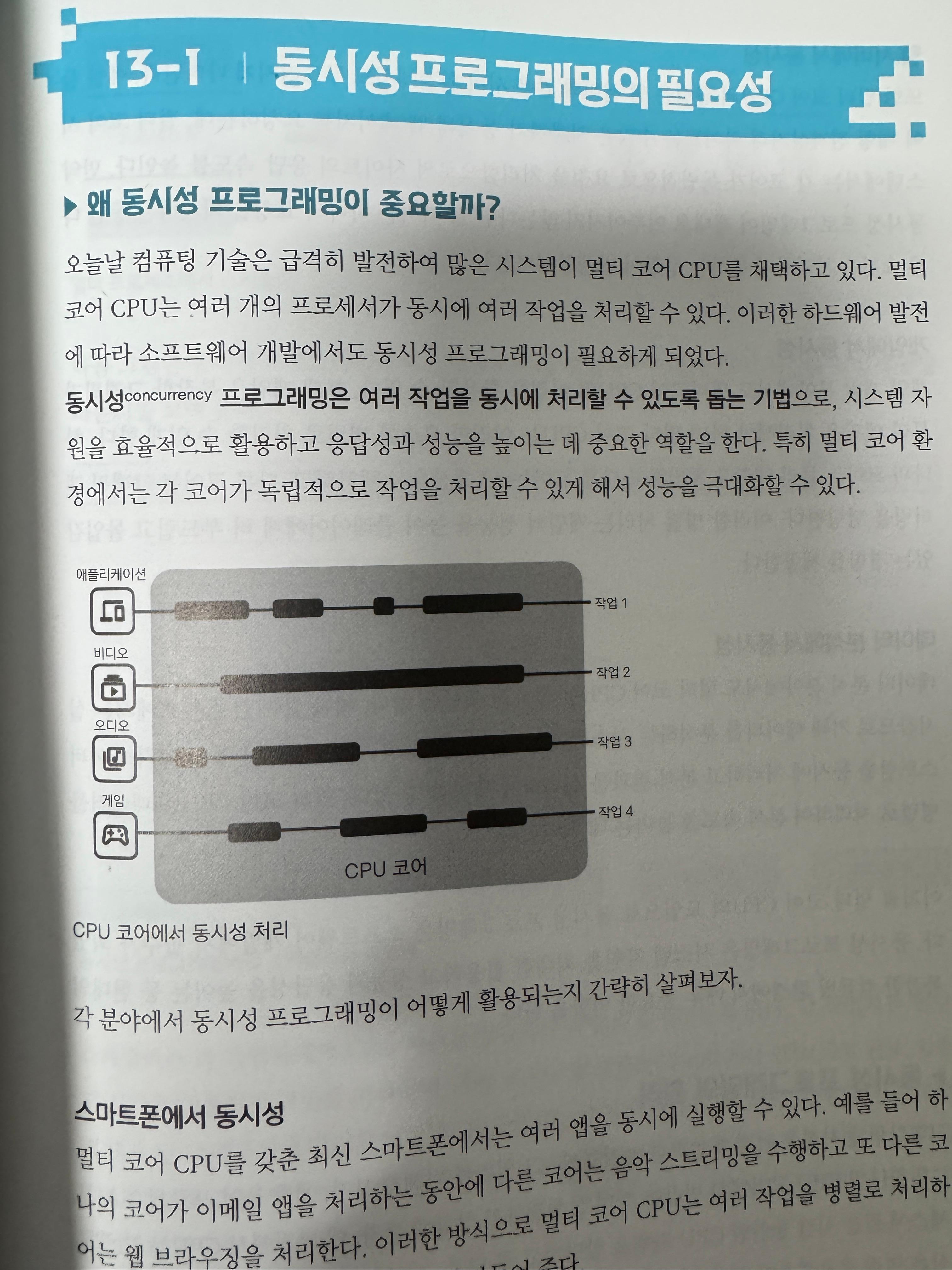 동시성의 경우 여러 작업이 동시에 처리되도록 하는 것인데 여러가지 테스크를 동시에 고성능으로 처리할 수 있도록 잘 짜는것이 중요하다. 최근 하드웨어 발달로 대부분의 기기들이 멀티 코어는 당연히 탑재되어 있는 경우가 많기 때문에 우리가 반드시 알아둬야하고, 이를 잘 활용해야한다.