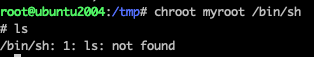 이 이유는 myroot 밑에 /bin 디렉토리와 sh 명령어가 존재하지 않아 아무것도 실행할 수 없기 때문이다. 따라서 실제로 해당 디렉토리와 명령어를 만들어주어야 작동시킬 수 있다.