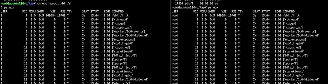 왼쪽은 myroot의 ps이고, 오른쪽은 호스트의 ps인데 둘의 차이가 없었다.