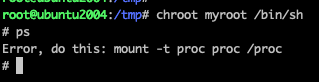 동일하게 마운트 명령어를 먼저 넣어준 다음 proc 디렉터리를 만들고 실제로 chroot 속에서 mount를 시켜보자.