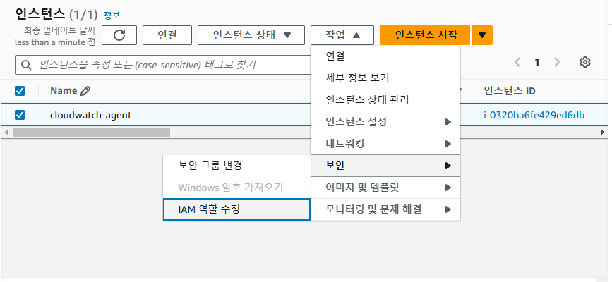 내가 작업을 원하는 인스턴스를 클릭한 후에 작업 > 보안 > IAM 역할 수정으로 들어갑니다.