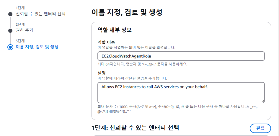 먼저 EC2에서 CloudWatch Agent의 지표를 수집할 수 있게 역할과 정책을 생성해야 합니다.