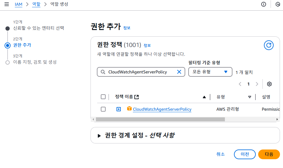CloudWatchAgentServerPolicy 정책을 추가합니다.