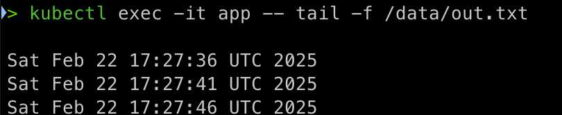 args: ["-c", "while true; do echo \$(date -u) >> /data/out.txt; sleep 5; done"]