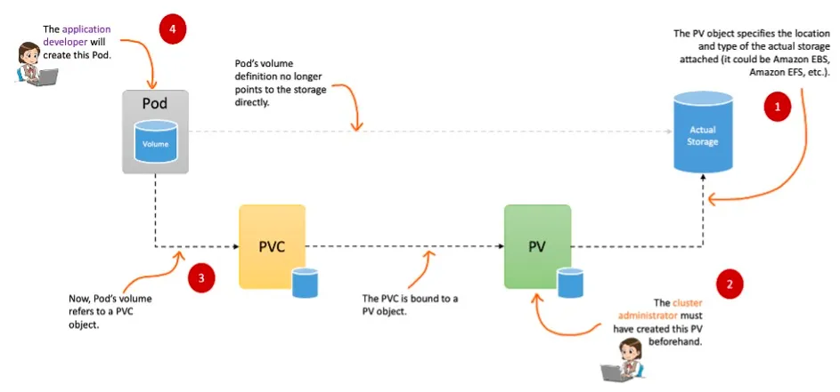 그래서 나온게 PV(Persistent Volume), PVC(Persistent Volume Claim)이다. 이 둘은 한쌍으로 PV는 어느 노드에서도 연결하여 사용이 가능하도록 만들어진 볼륨이고 PVC는 PV를 생성하기 위한 명령서랑 비슷한 것으로 하나로 묶어서 보면된다. 왜냐하면 기본적으로 pod는 PV를 직접 호출하는게 아니라 PVC에 의해서 PV를 가져오기 때문이다.