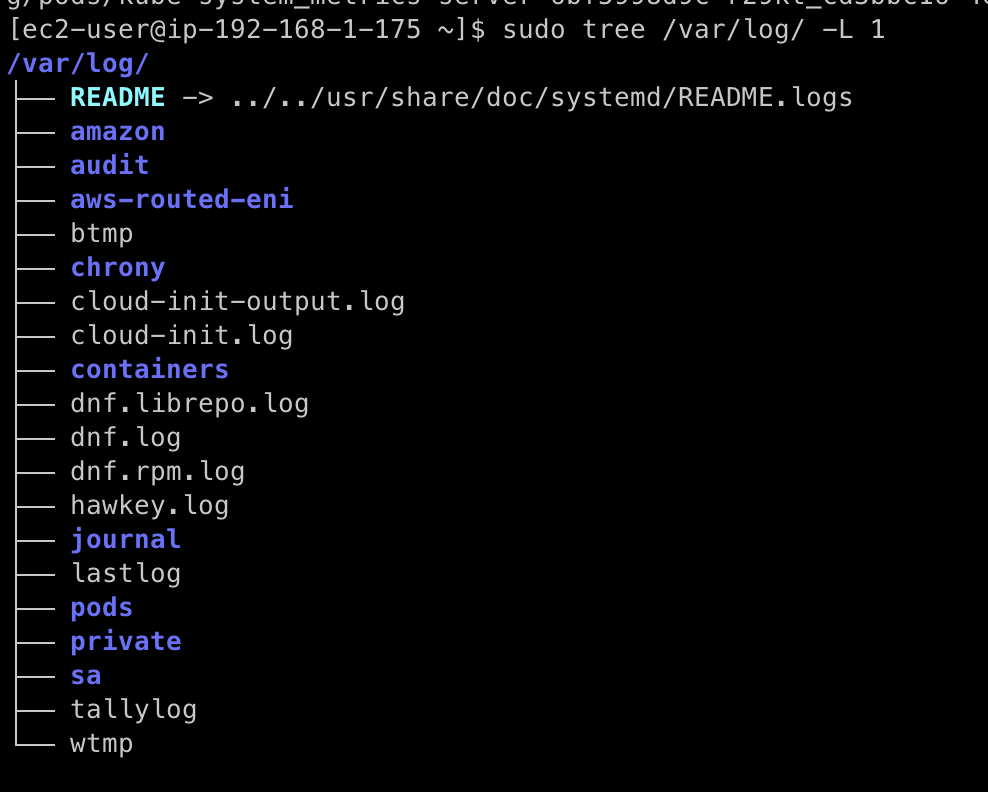 EKS의 경우 /var/log/containers에서 저장되는 것을 확인할 수 있습니다.
