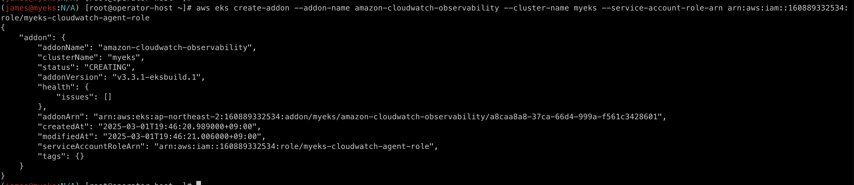 aws eks create-addon --addon-name amazon-cloudwatch-observability --cluster-name myeks --service-account-role-arn arn:aws:iam::<IAM User Account ID직접 입력>:role/myeks-cloudwatch-agent-role